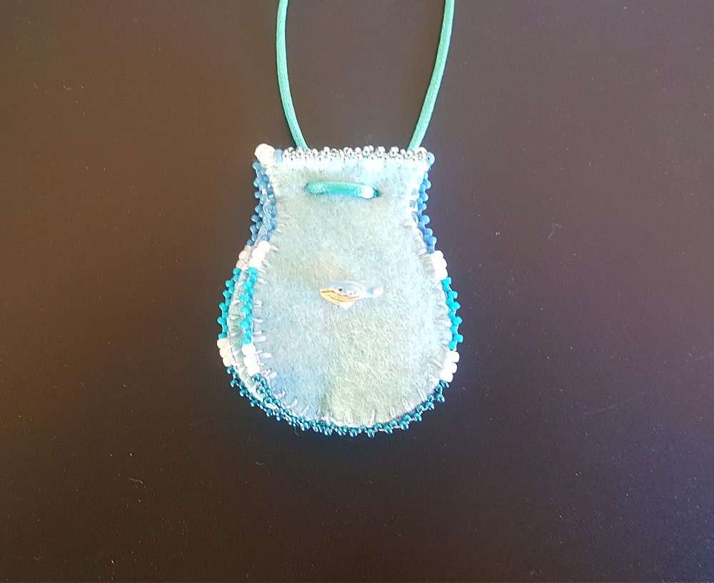 4- Zijdig medicijnbuideltje van wolvilt om de hals te dragen