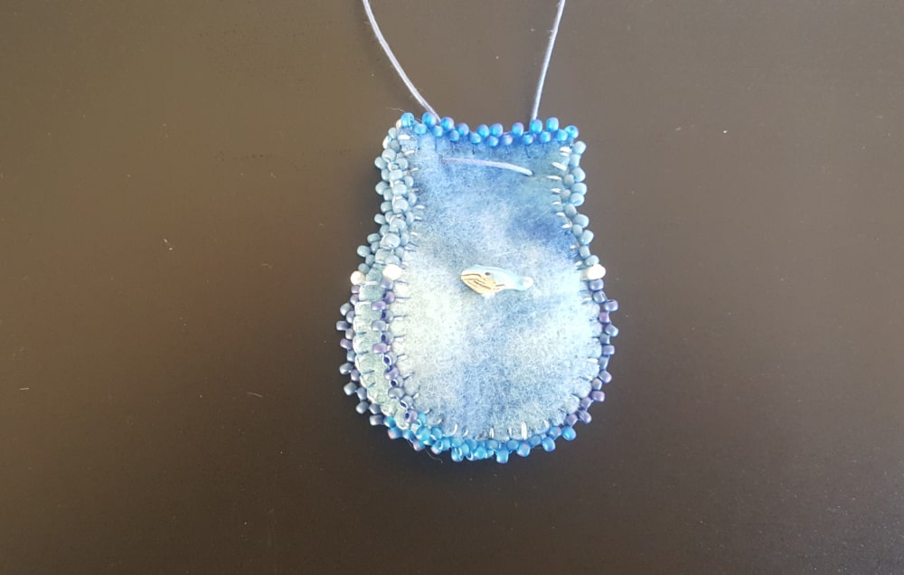 Deze vierzijdige hanger van wit en lichtblauw gemêleerde wolvilt is met liefde handgemaakt